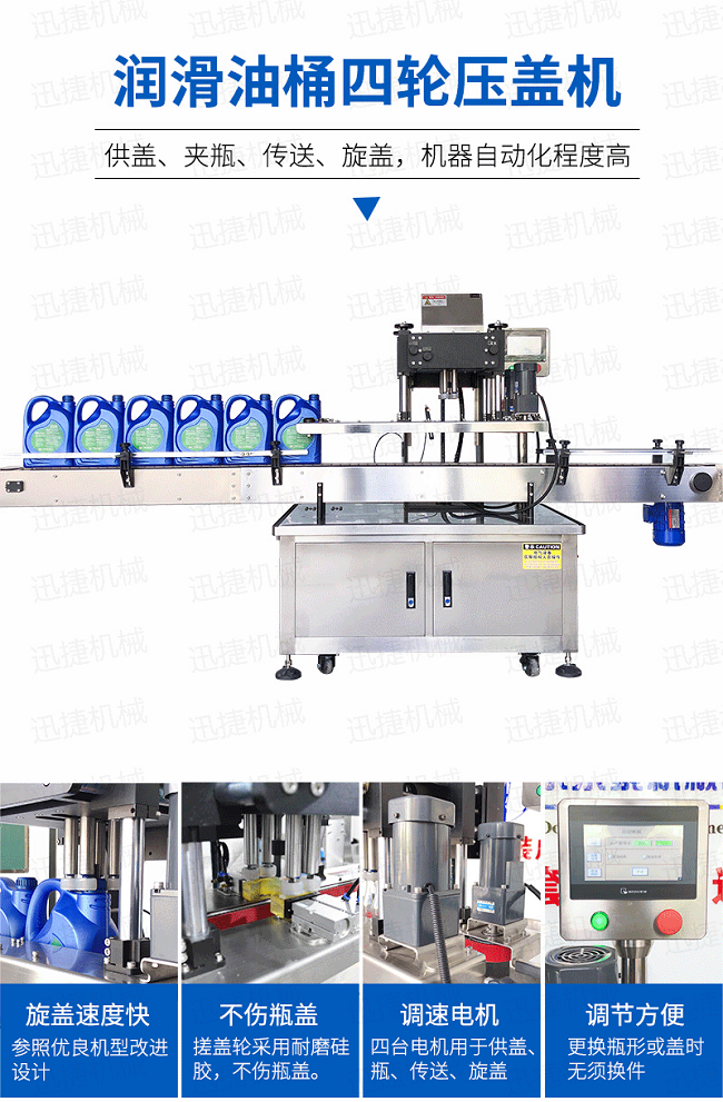 全自動旋蓋機是參照國機型改進設(shè)計、旋蓋速度快,合格率高、操作方便??蛇m用于食品、制藥、日化、農(nóng)藥、化妝品等行業(yè)的不同瓶形的旋蓋。四臺調(diào)速電機分別用于供蓋、夾瓶、傳送、旋蓋,機器自動化程度高,穩(wěn)定性好,調(diào)節(jié)方便,更換瓶形或蓋時無須備件,只需作調(diào)整即可完成(如配上蓋機,可進行自動上蓋)可以根據(jù)實際需要選配。