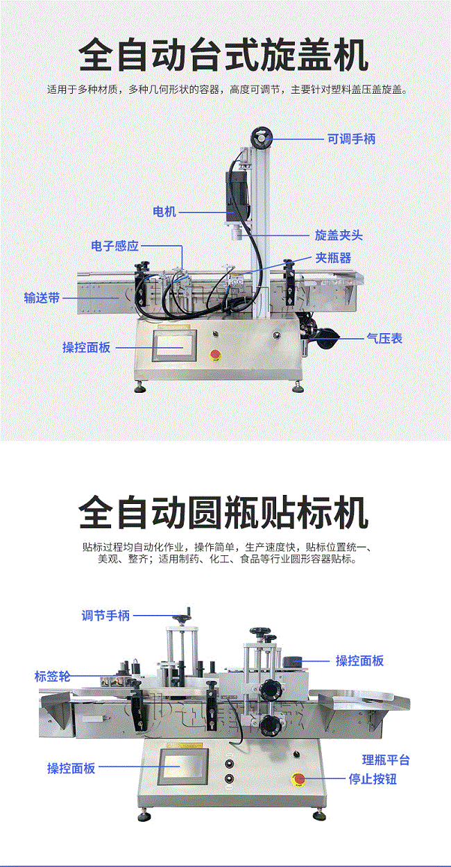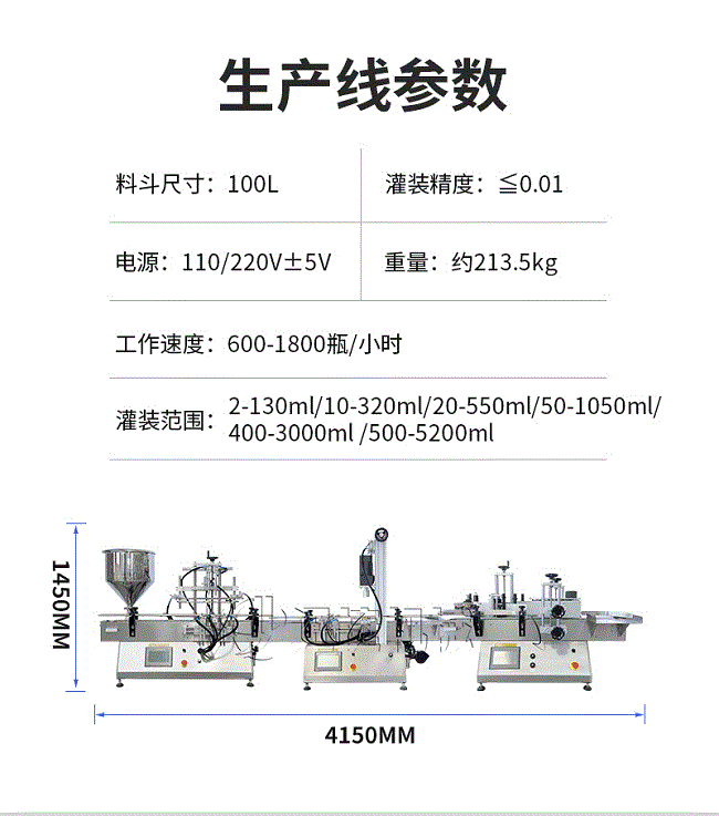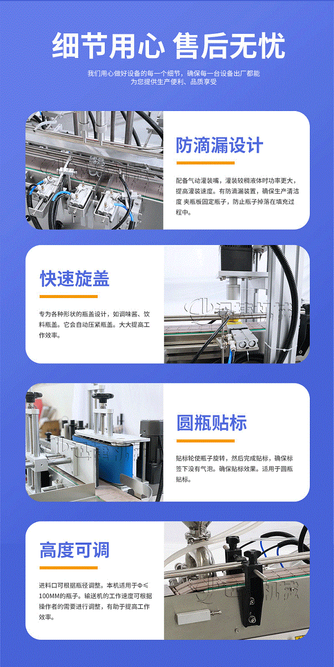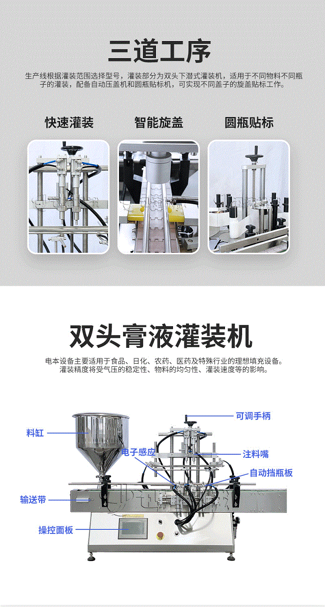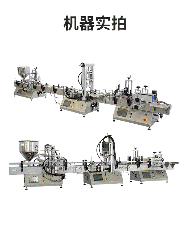 產(chǎn)品說明:生產(chǎn)線根據(jù)灌裝范圍選擇型號,灌裝部分為雙頭下潛式灌裝機(jī),適用于不同物料不同瓶子的灌裝,配備自動壓蓋機(jī)和圓瓶貼標(biāo)機(jī),可實現(xiàn)不同蓋子的旋蓋貼標(biāo)工作。