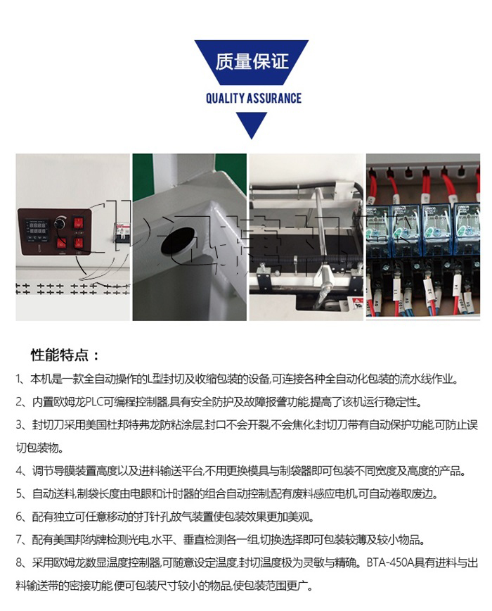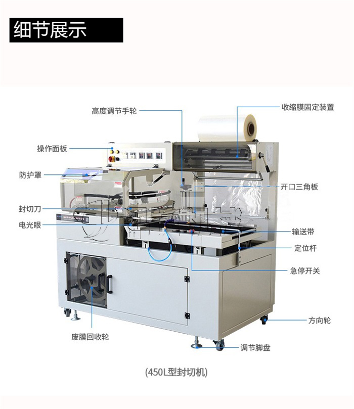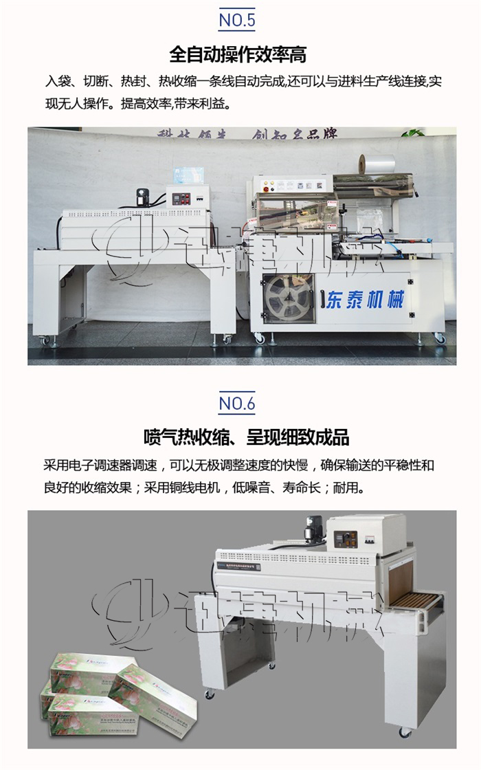 全自動(dòng)套膜收縮機(jī)是由全自動(dòng)450L封切機(jī)和熱收縮機(jī)組成,入袋、切斷、熱封、熱收縮一條線自動(dòng)完成,還可以與進(jìn)料生產(chǎn)線連接,實(shí)現(xiàn)無人操作。提高效率,帶來利益。全自動(dòng)化封切收割,適用于各種物品的套膜及收縮,生產(chǎn)效率高。