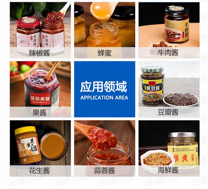 辣椒醬灌裝機(jī)采用活塞式灌裝原理,適用于調(diào)味品中帶顆粒并且濃度較大的辣椒醬、豆瓣醬、花生醬、香菇醬、果醬、牛油火鍋底料、紅油火鍋底料、蝦醬等較為粘稠醬類(lèi)的灌裝。